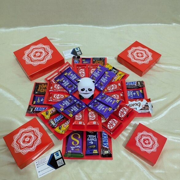 A magical chocolate explosion box filled with assorted chocolates and a cute glowing Panda LED light perfect for sweet surprises.