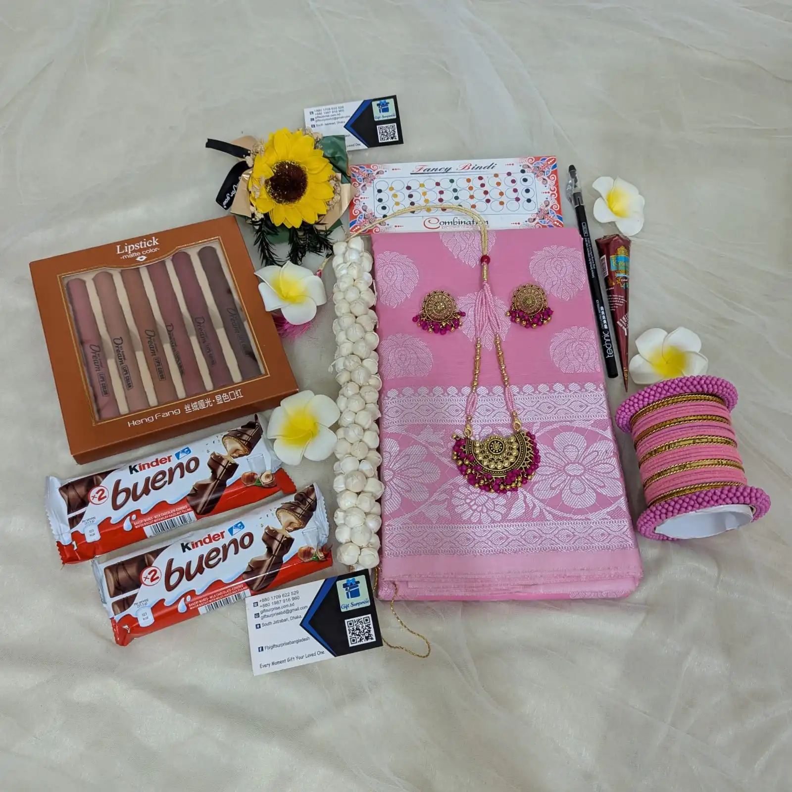 Pink Katan Saree Gift Hamper with Jewelry, Lipstick Set, Bangles & Chocolates