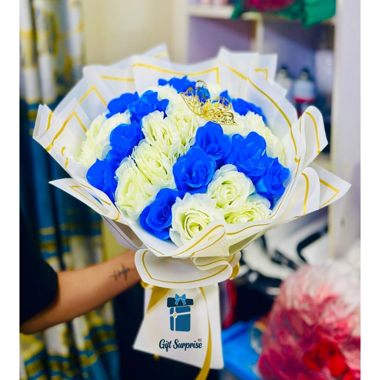 This stunning bouquet combines royal blue and creamy white roses, symbolizing purity and deep affection. Perfect for birthdays, anniversaries, or special surprises — crafted with love by Gift Surprise BD to make every moment feel royal. 💙🤍