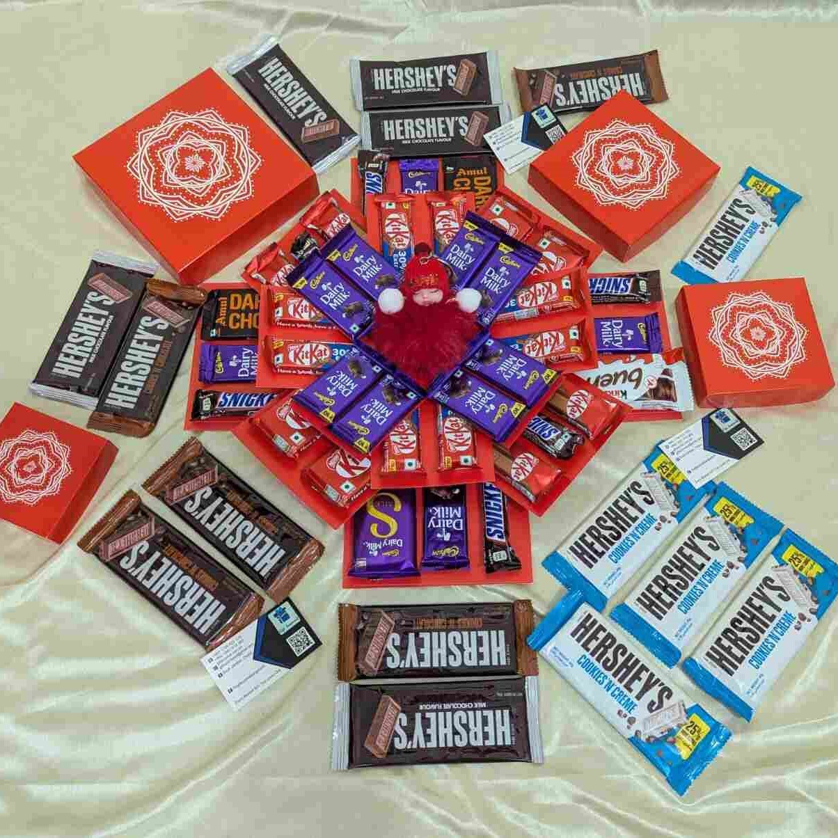 Surprise your loved one with our beautifully handcrafted Chocolate Explosion Gift Box, designed to create unforgettable moments of joy. This premium gift box includes 38 pieces of assorted chocolates, a cute teddy bear, and an additional 15 pieces of Hershey’s chocolates to make the surprise even sweeter.